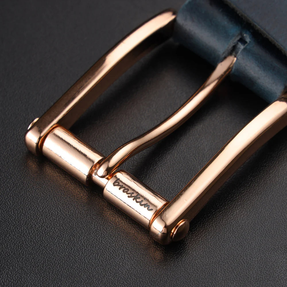 Meet the Denim Blue leather belt, a stylish addition to your men's accessories collection. This premium cow leather belt in a vibrant denim blue color is soft and supple, with a smooth finish that exudes high-quality leather goods. A sleek rose gold buckle adds a touch of sophistication, making it perfect for dressing up or adding a pop of color to your everyday wear. With its timeless design, exceptional craftsmanship, and durable comfort, this men's leather belt is a staple for years to come, ideal for pairing with jeans pants or formal attire. Whether you're looking for a fashion belt to elevate your style or a casual belt for everyday wear, this 'Denim Blue' belt is a great choice.